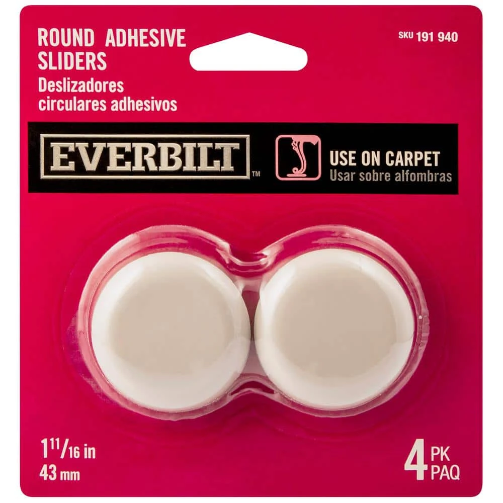 1-11/16 in. Round adhesive sliders allow you to move heavy or bulky objects with ease while moving, rearranging, re-decorating, and more. The self-stick adhesive ensures a secure hold to object being moved. Hard, plastic sliders feature a thick, plastic sliding surface with a curved edge allowing furniture to slide effortlessly across even and uneven surfaces.