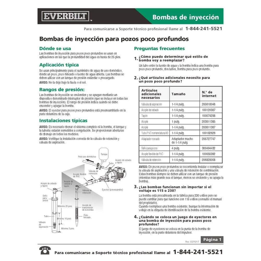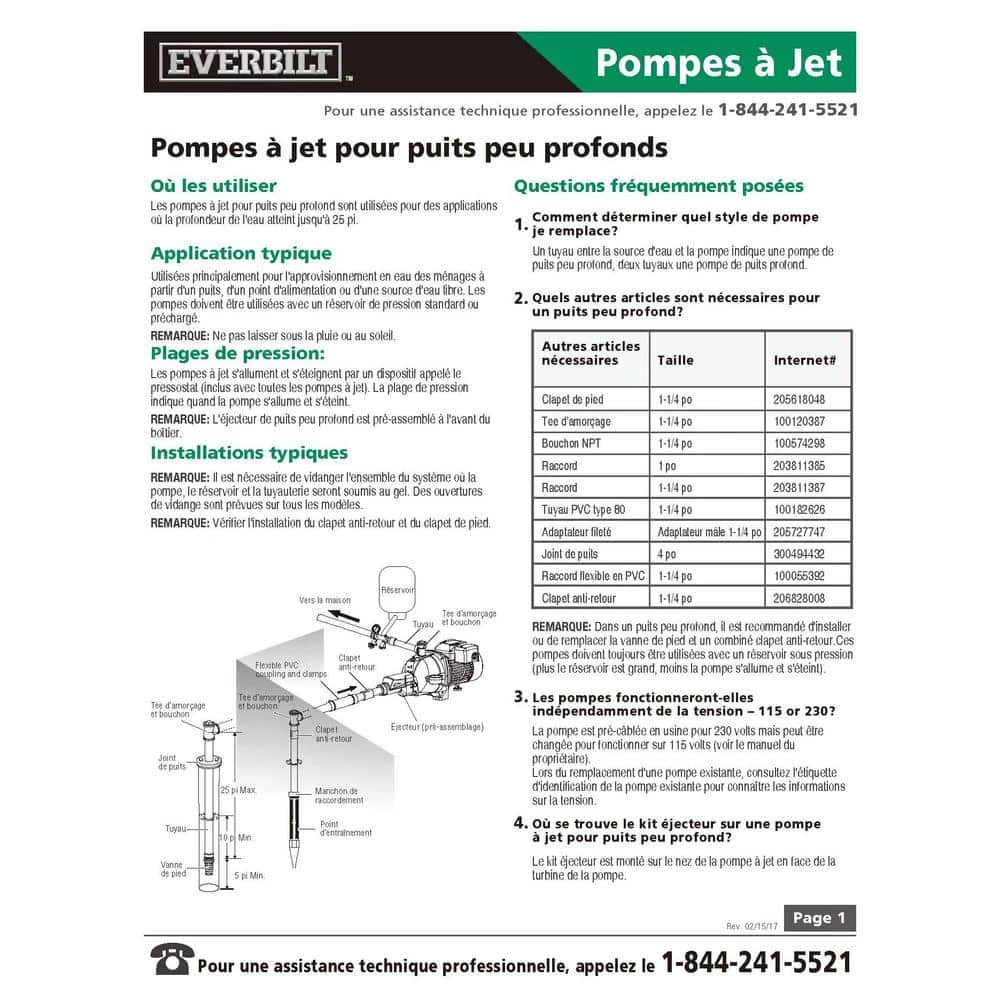Keep the clean water flowing into your home, cabin or farm, with the Everbilt 1/2 HP Shallow Well Jet Pump. The pump housing is constructed of fiberglass-reinforced thermoplastic, which is both light in weight and corrosion-resistant. The pump delivers water at a flow rate of 432 GPH at 40 PSI and 0 ft. of lift. The motor is safeguarded by an auto reset thermal overload protector to prevent overheating. It is pre-wired for 115/230 Volt operation, factory preset at 230V. The pump comes ready to install with a 1 Year warranty.