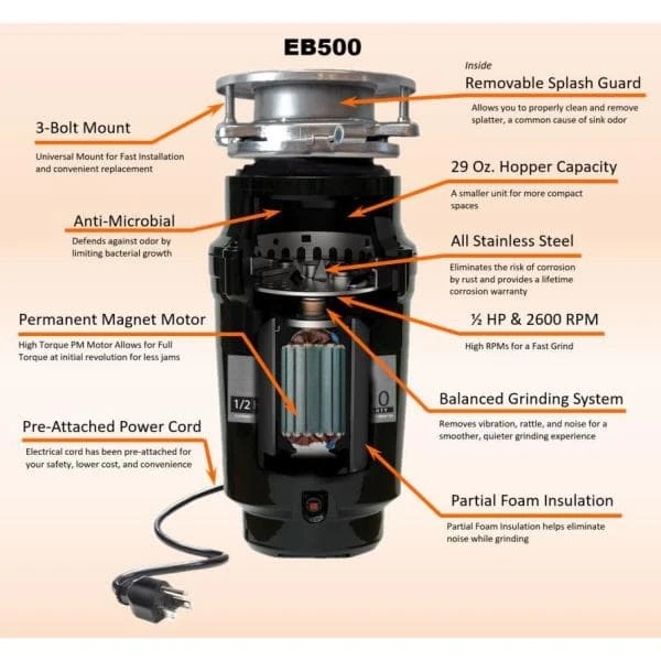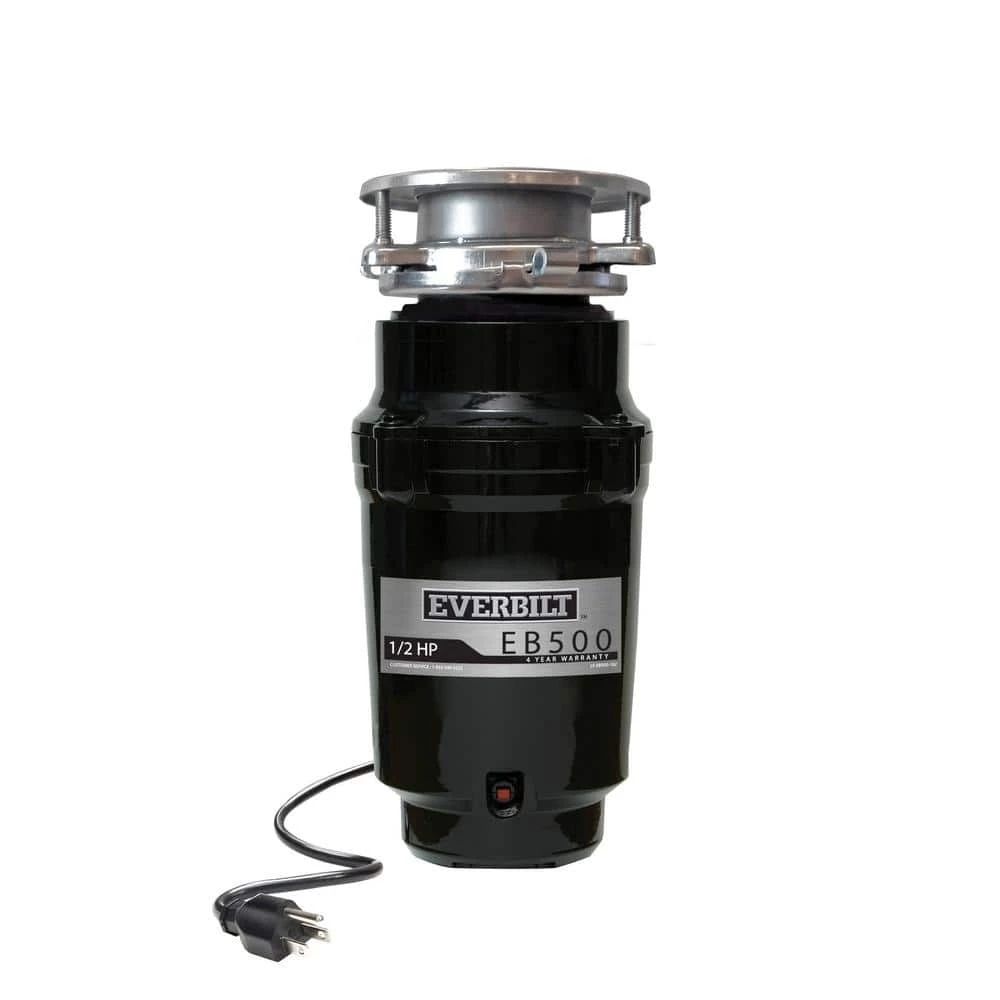 The Everbilt 1/2 HP Garbage Disposal is designed to provide a premium experience from installation through your post-dinner cleanup. This Disposal comes with a pre-connected power cord and universal 3-bolt mounting system to allow for quick and easy installation/replacement. Packed with features, this model has been fitted with Full Stainless Steel grinding components, a balanced grind system for smooth grind with reduced vibration, and an anti-bacterial odor-reducing chamber. Backed by a 4-year warranty and lifetime corrosion warranty, this disposal is sure to keep your sink working great for years to come.