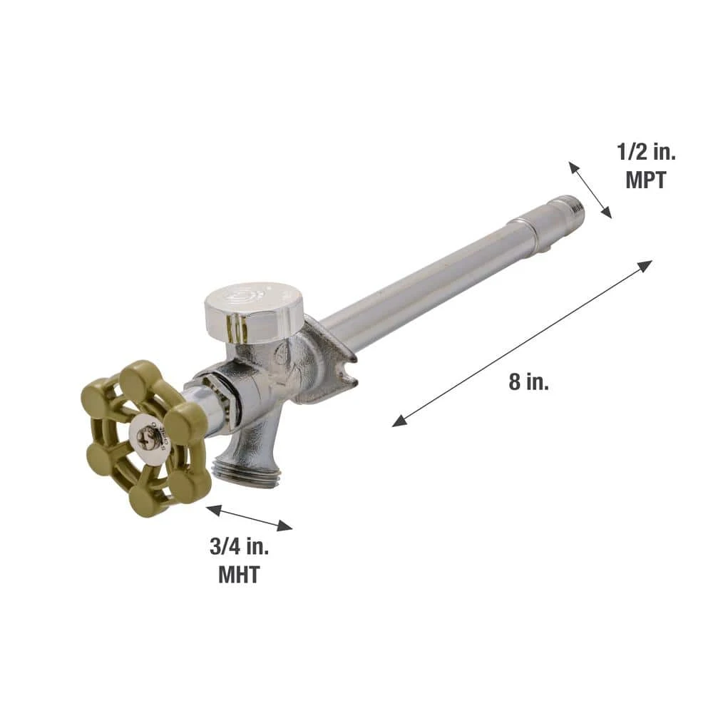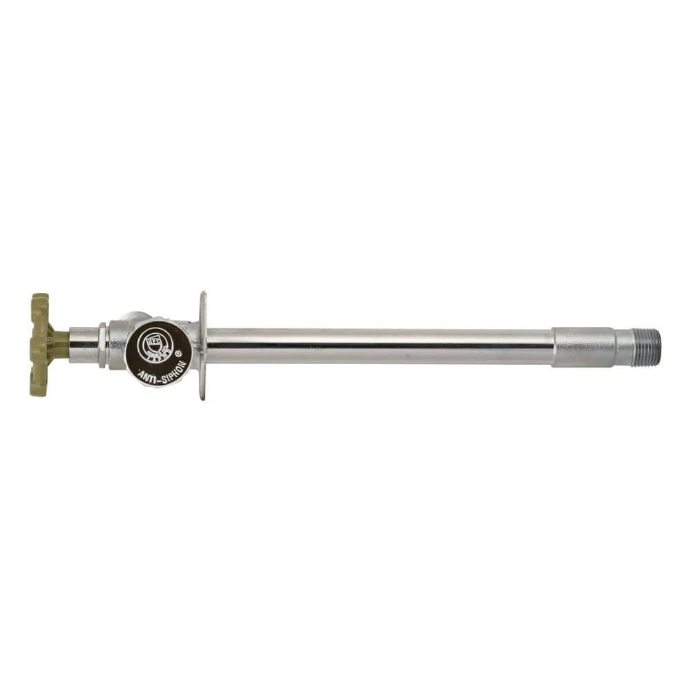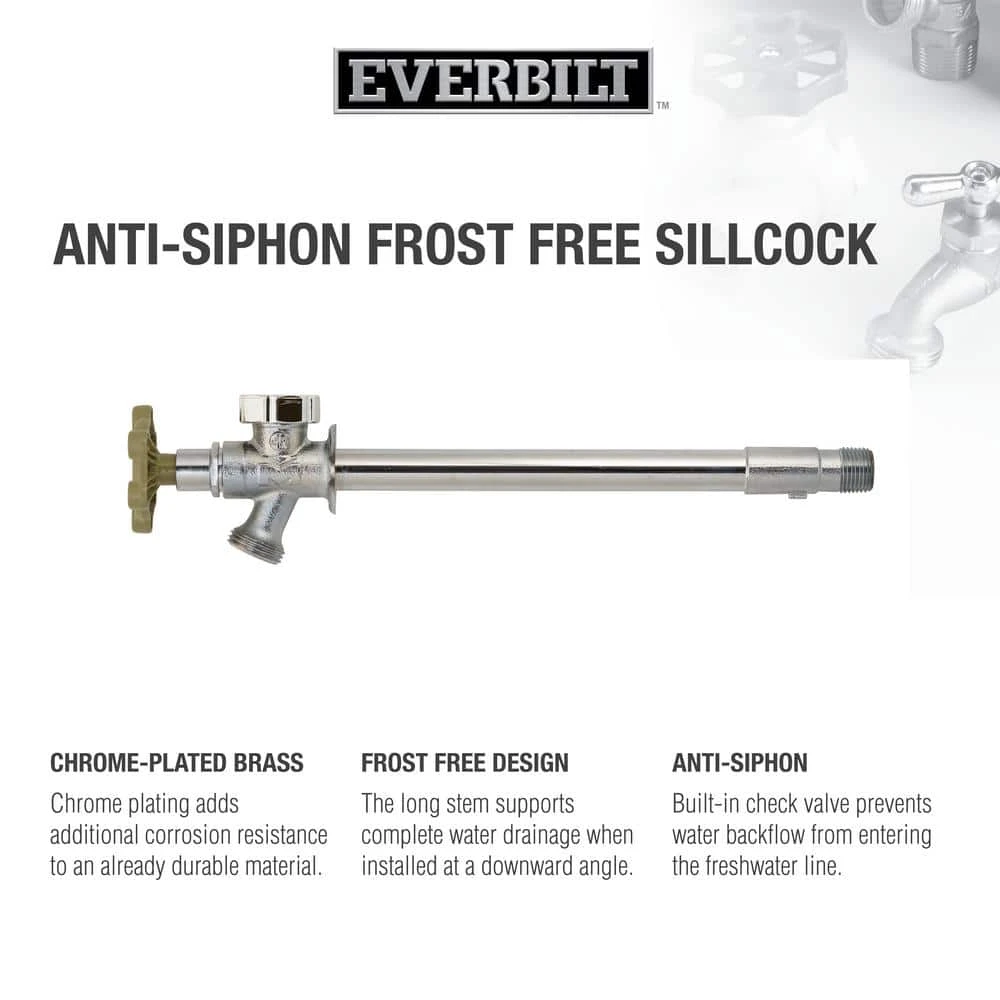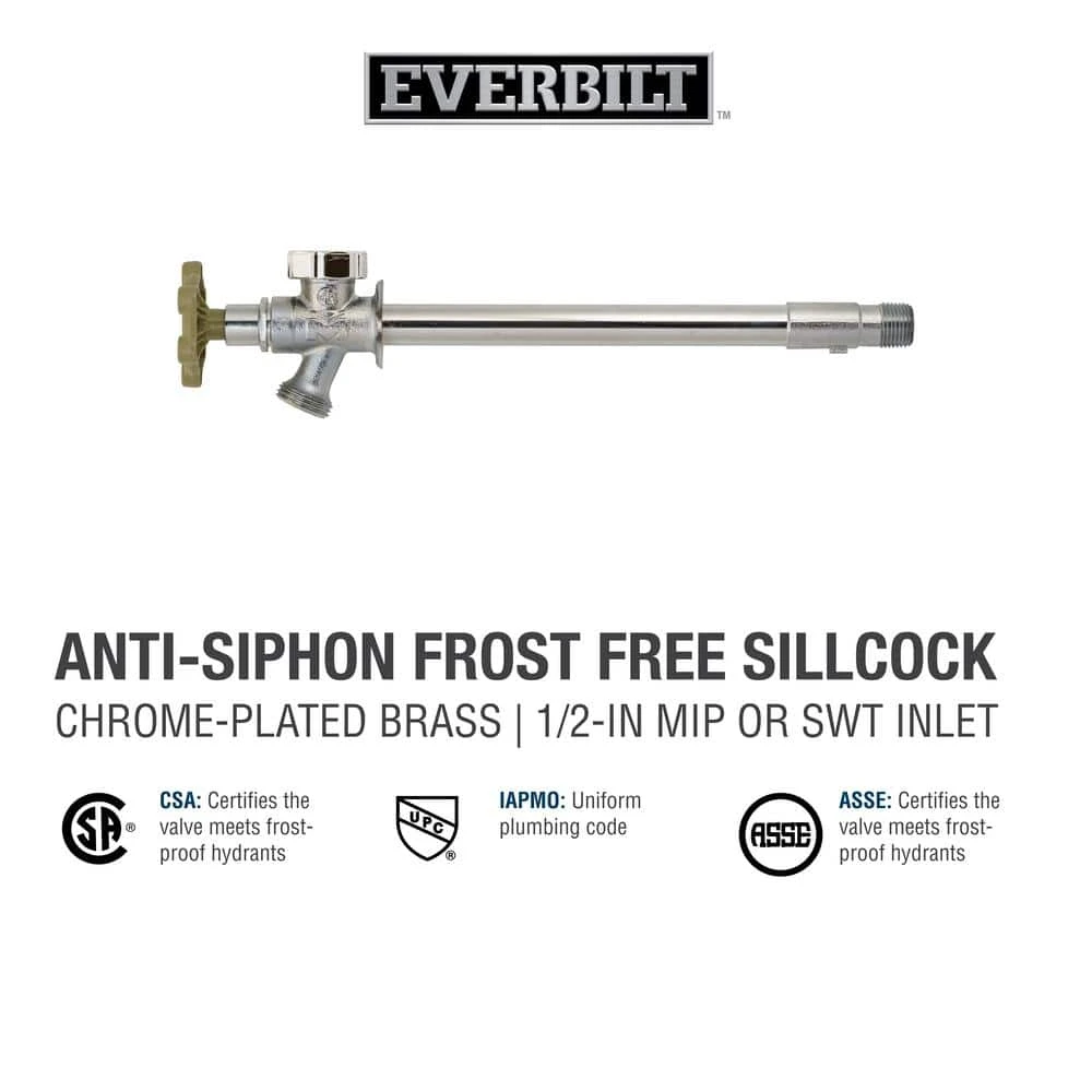 The Everbilt 1/2 in. diameter x 8 in. of length Brass Male x Sweat Anti-Siphon Frost Free Sillcock is a great way to provide a source of water year-round to areas of structures that are subject to freezing temperatures. The sillcock uses an integrated vacuum breaker with a backflow device to help keep contaminated water from entering the potable water supply. Notched flange for stable installation on siding.