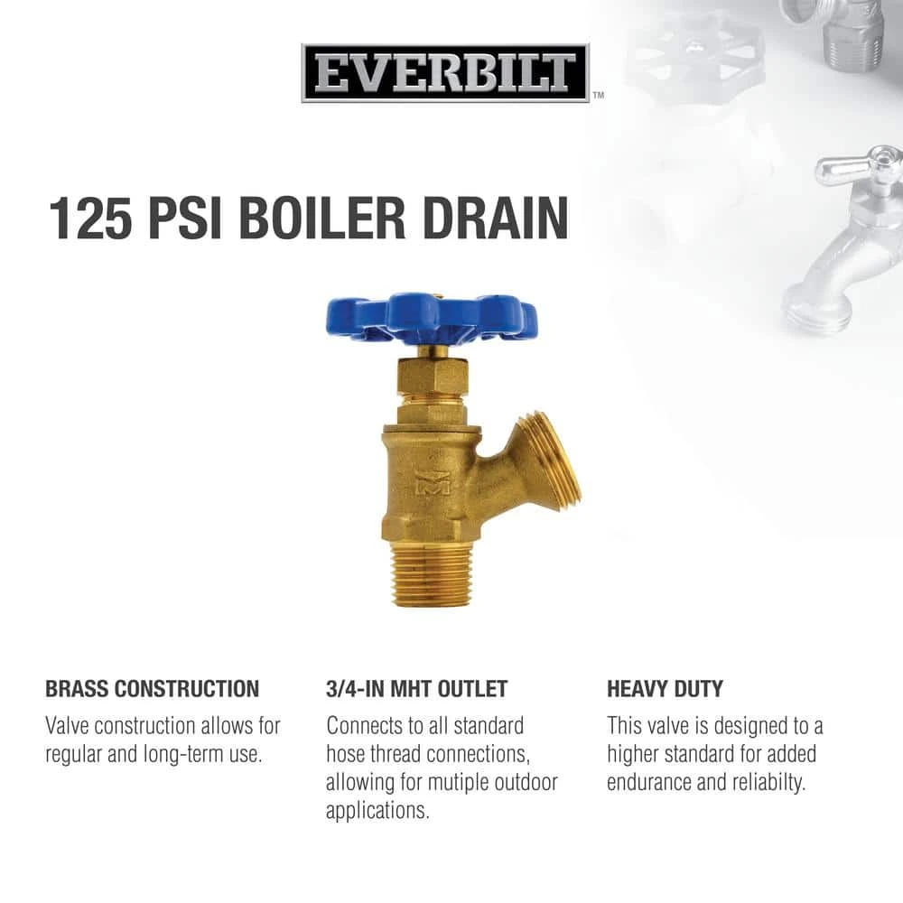 Built to allow drainage from boiler drains, this Boiler Drain Valve by Everbilt allows you to easily maintain your boiler by releasing any sediment that may have accumulated. This valve is also good to use as a washing machine hookup or for general purpose use with an outdoor hose. Boiler Drains are an excellent multi-purpose valve for both commercial and residential applications.