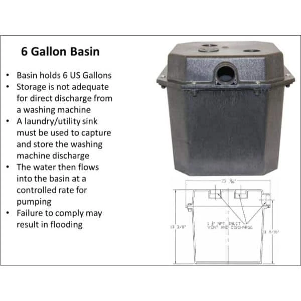 - System includes an automatic sump pump, a check valve and a heavy duty 6 Gal. basin