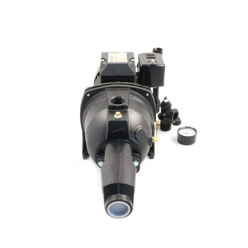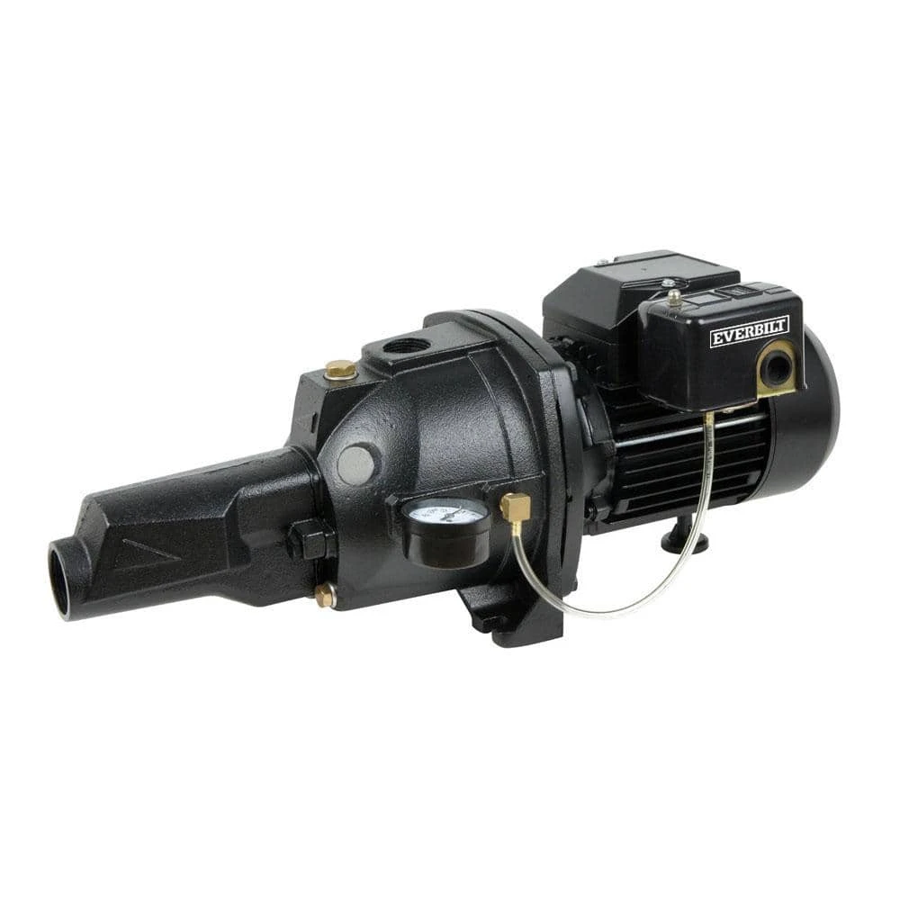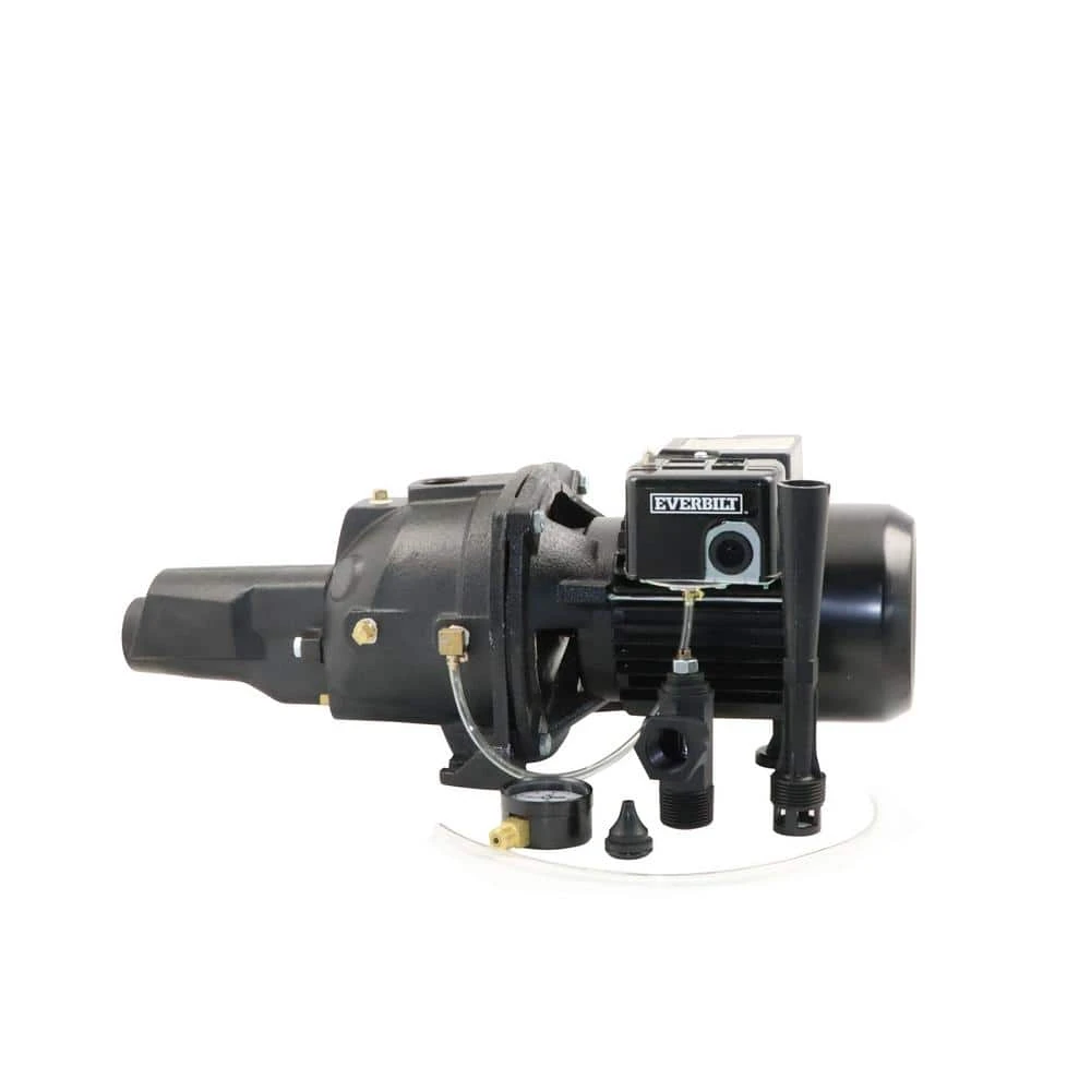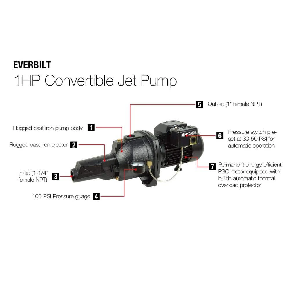 The Everbilt 1 HP rugged cast iron convertible jet pump has superior performance at depths to water to 70 ft. or less. Self-priming after pump housing is initially filled. The unit is supplied with a built-in 30/50 psi pressure switch for automatic operation and a pressure gauge. The unit is supplied with both the shallow well and deep well ejectors. The unit comes with the shallow well jet ejector installed on the pump for applications with depths to water 25 ft. and below. The deep well venturi and nozzle is supplied for deep well applications. For deep well applications with water depths over 25 ft. to 70 ft., the venturi and nozzle are placed in the well on the piping. The unit is supplied with a 1-year warranty.