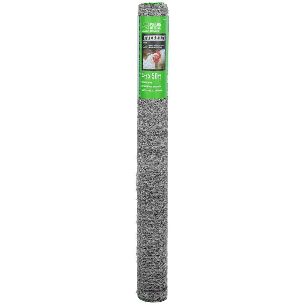 Flexible and lightweight, EVERBILT 1 in. x 4 ft. x 50 ft. Poultry Netting is constructed from galvanized, zinc-coated steel wire for durability and rust protection. Versatile in use, Everbilt chicken wire can create chicken coops, animal confinement, soil erosion prevention, garden protection, plant support, arts & craft projects, and more.Everbilt poultry netting features a hexagon-shaped wire mesh netting designed to be durable while remaining flexible to adapt to a wide variety of applications. This poultry fence is packaged in compact mesh fence rolls, making it easy to handle and transport until time to use. U-posts (not included) are recommended every 5 ft. for fencing applications for an effective fencing style.