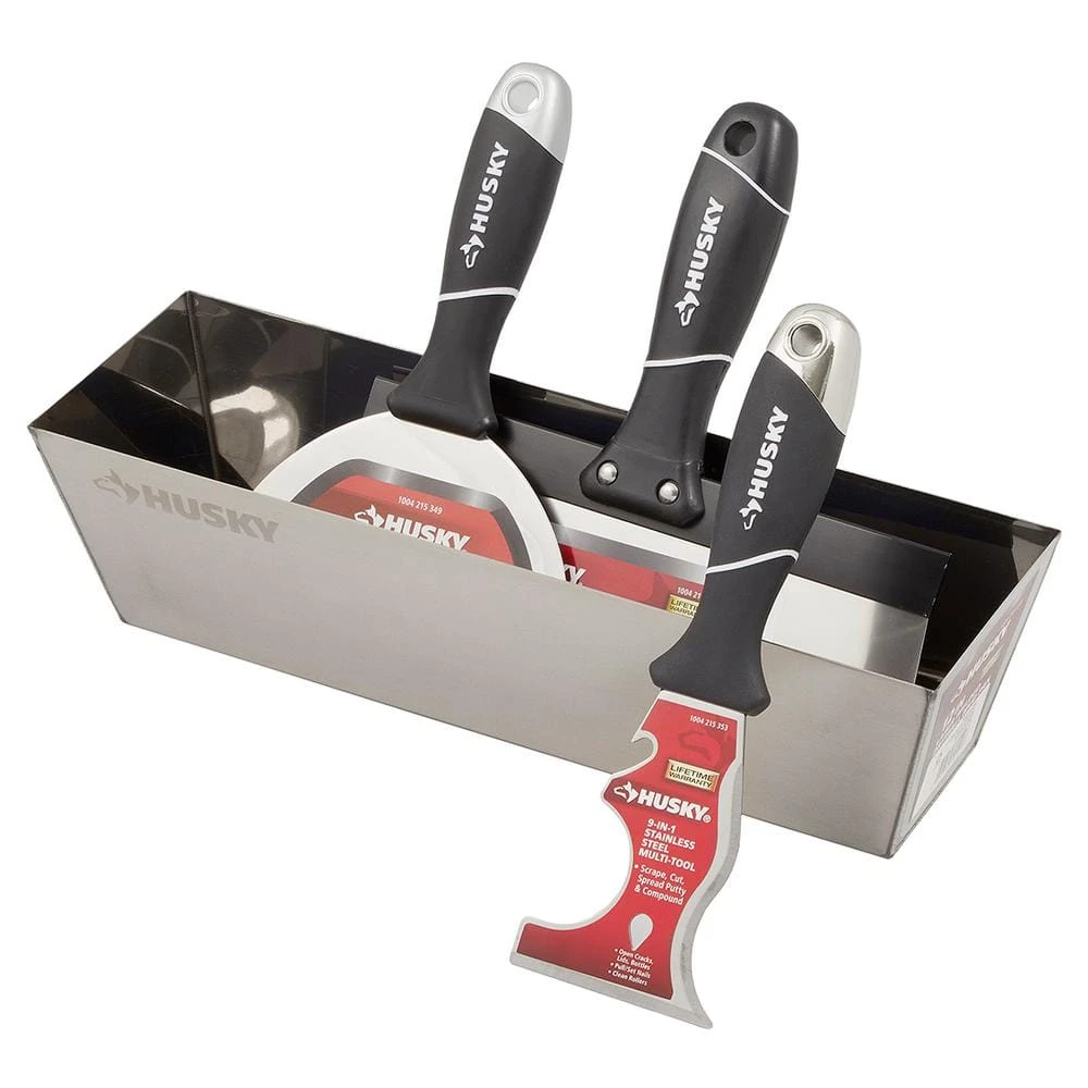 This set includes a 10 taping knife, a 6 in. joint knife, a 3 in. 9 iun 1 multi-tool and a stainless steel mud pan, The Husky drywall taping and joint knives are made of hardened and tempered stainless steel for durability and offer excellent control for feathering and knockdown texturing. The Husky 12 in. mud pan is made of heavy-gauge stainless steel. It is watertight thanks to laser-welded seams. Tapered ends and sides provide a comfortable grip. The Husky 9-in-1 multi-propose tool is designed for the trade professional. Made of hardened and tempered stainless steel for durability. It features a heavy-duty metal striking end and a multi-purpose blade design. The ergonomic pro soft grip handle ensures a firm comfortable grip. Tool features include: putty scraper, compound spreader, roller cleaner, crack opener, bottle opener, lid opener, nail puller, nail setter and utility cutter.