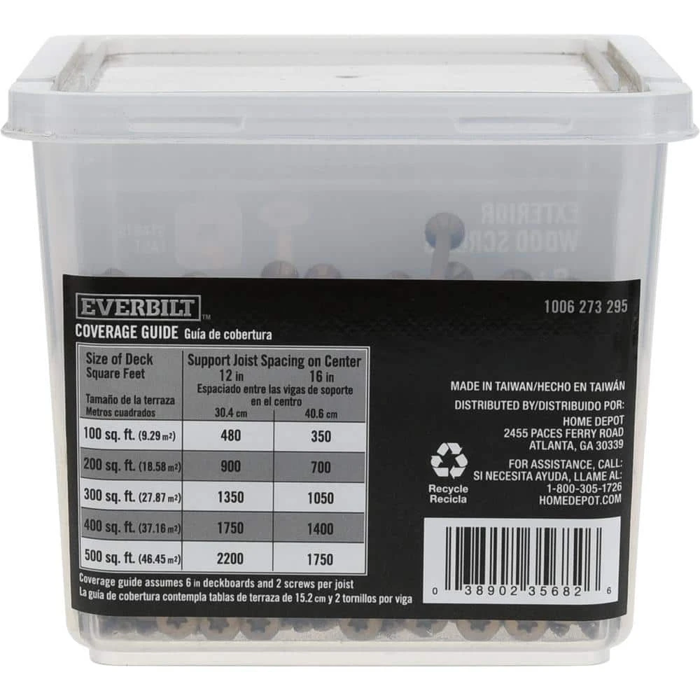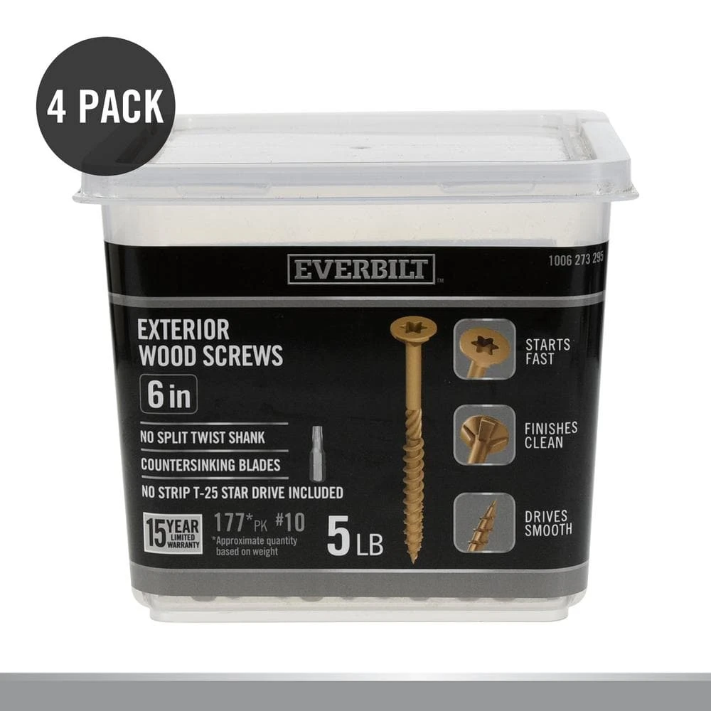 Everbilt high performance exterior wood screws are designed for wood construction and outdoor projects. Unique thread design features ensure a fast start without the need to pre-drill. The spiral shank enables smooth installation and the underhead nibs provide a clean, flush finish. These screws are designed for use with treated lumber and are guaranteed against corrosion.