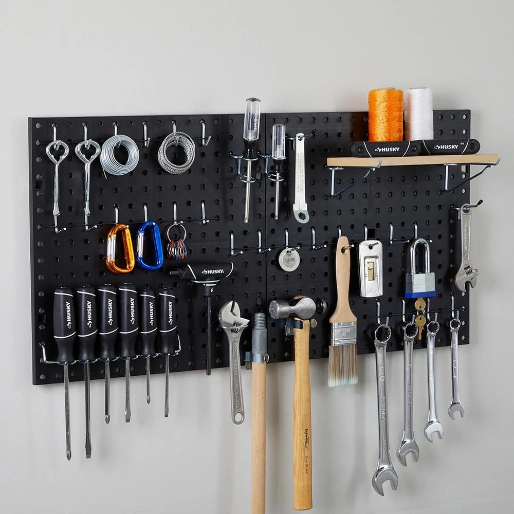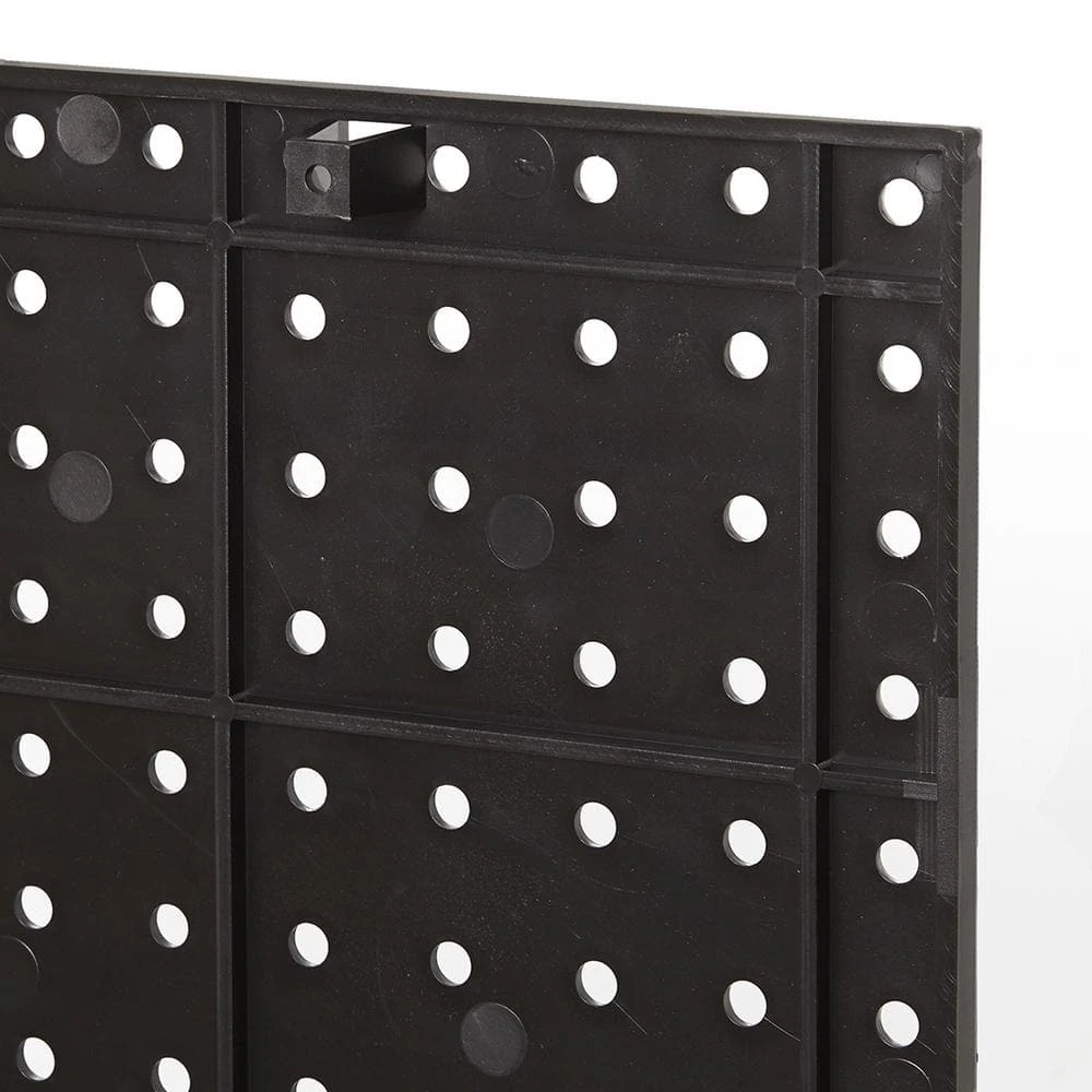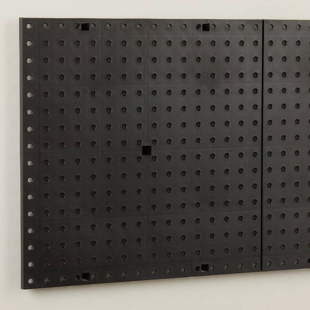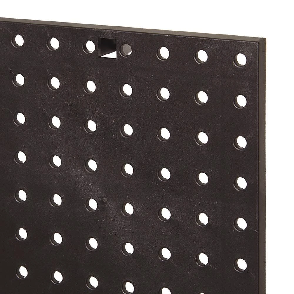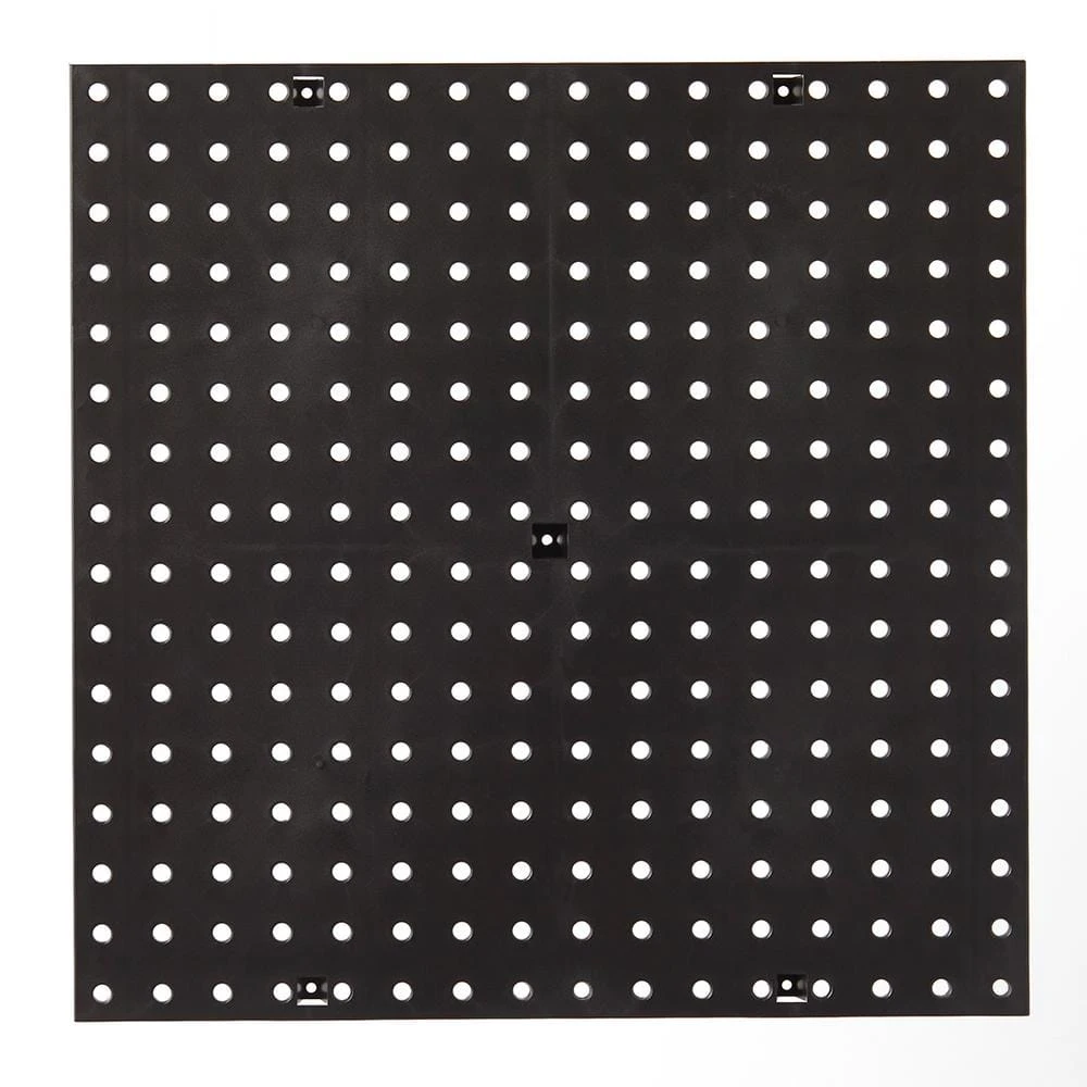 This 16 in. x 16 in. Black Plastic Pegboard provides a customizable peg board storage for a variety of spaces. Perfect for garages, basements, workshops and craft rooms. Customize your wall storage solution with this durable pegboard system. Pegboard holes are 1/4 in. Dia.