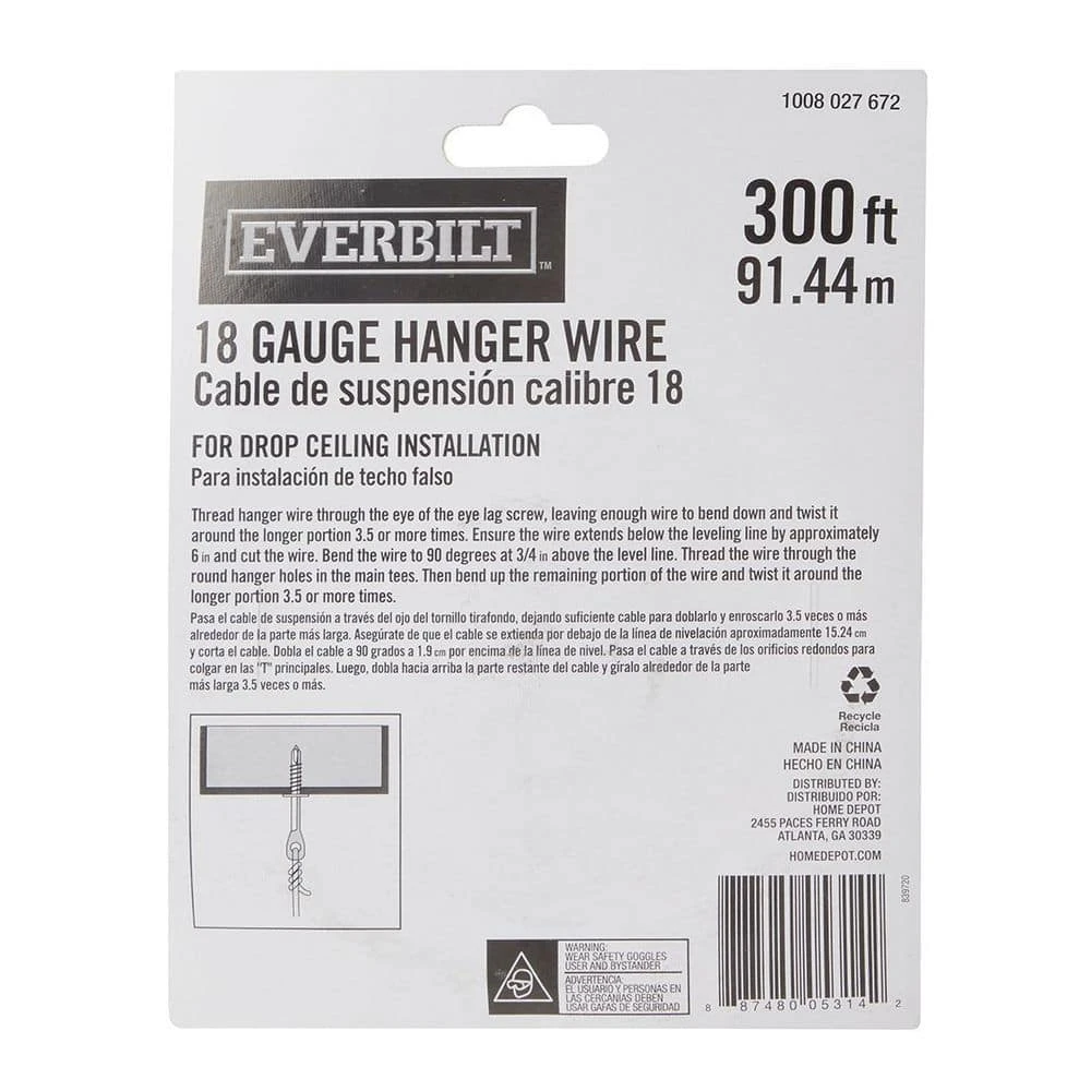 The Everbilt 18-Gauge Hanger Wire is ideal for residential use in installing drop ceiling grids. The hanger wire is designed for suspending main tees from fastened eye lag screws to support the ceiling grid. The product contains 300 ft. of 18-Gauge hanger wire which meets many residential application standards. Hanger Wire is a key part of the full Everbilt accessory line up for ceiling grid installation and is also included in the model 805354 Ceiling Grid Installation Kit.