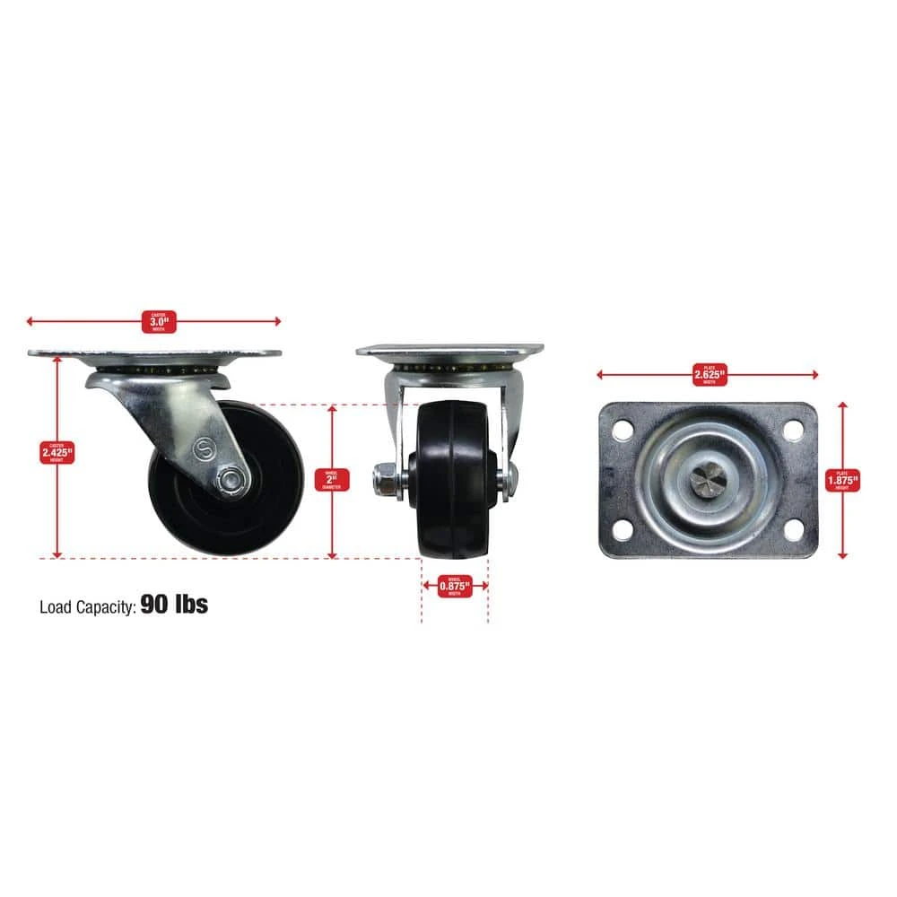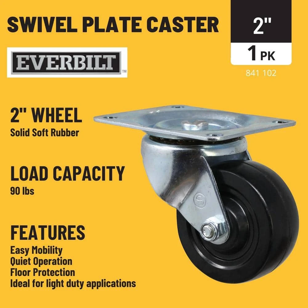 - 2 in. diameter black soft rubber wheel with ball bearing swivel and plate mount