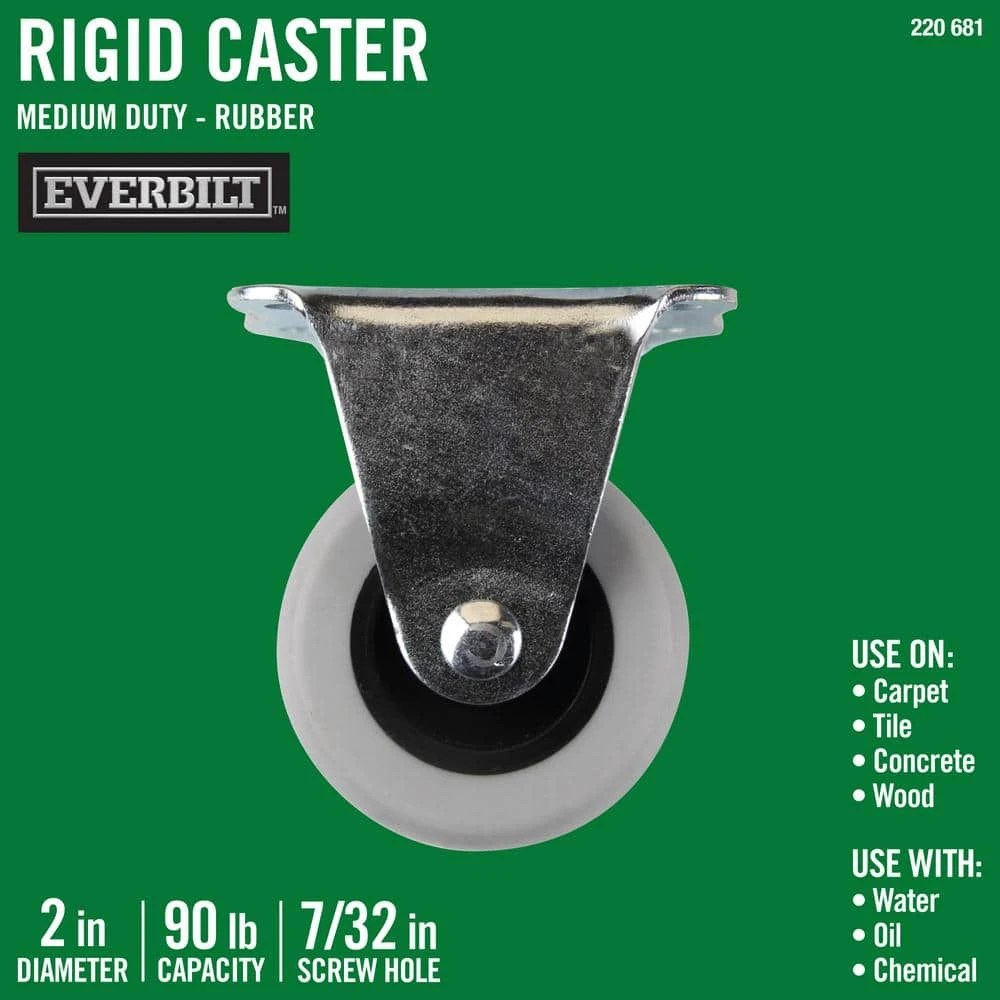 2 in. Rigid, non marking, rubber caster is designed for everyday residential use as well as use in labs, hospitals, food service and other institutional applications. The non-marking rubber provides a tough, yet soft ride, withstanding chemical, solvent exposure and more.