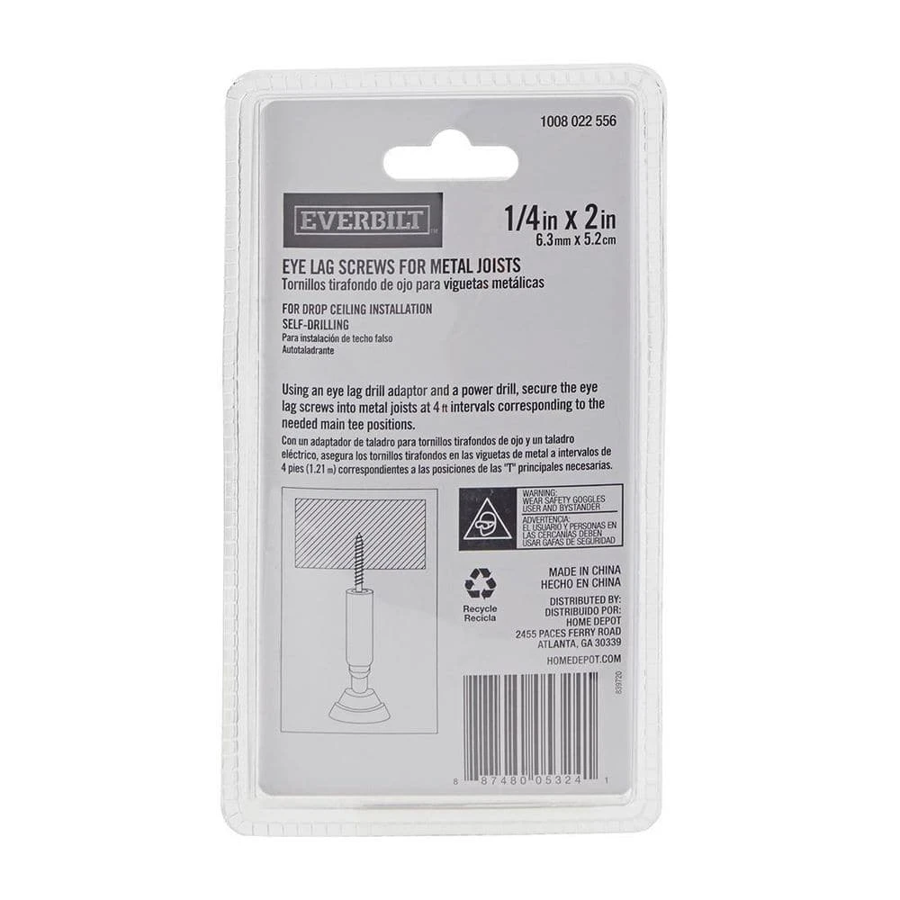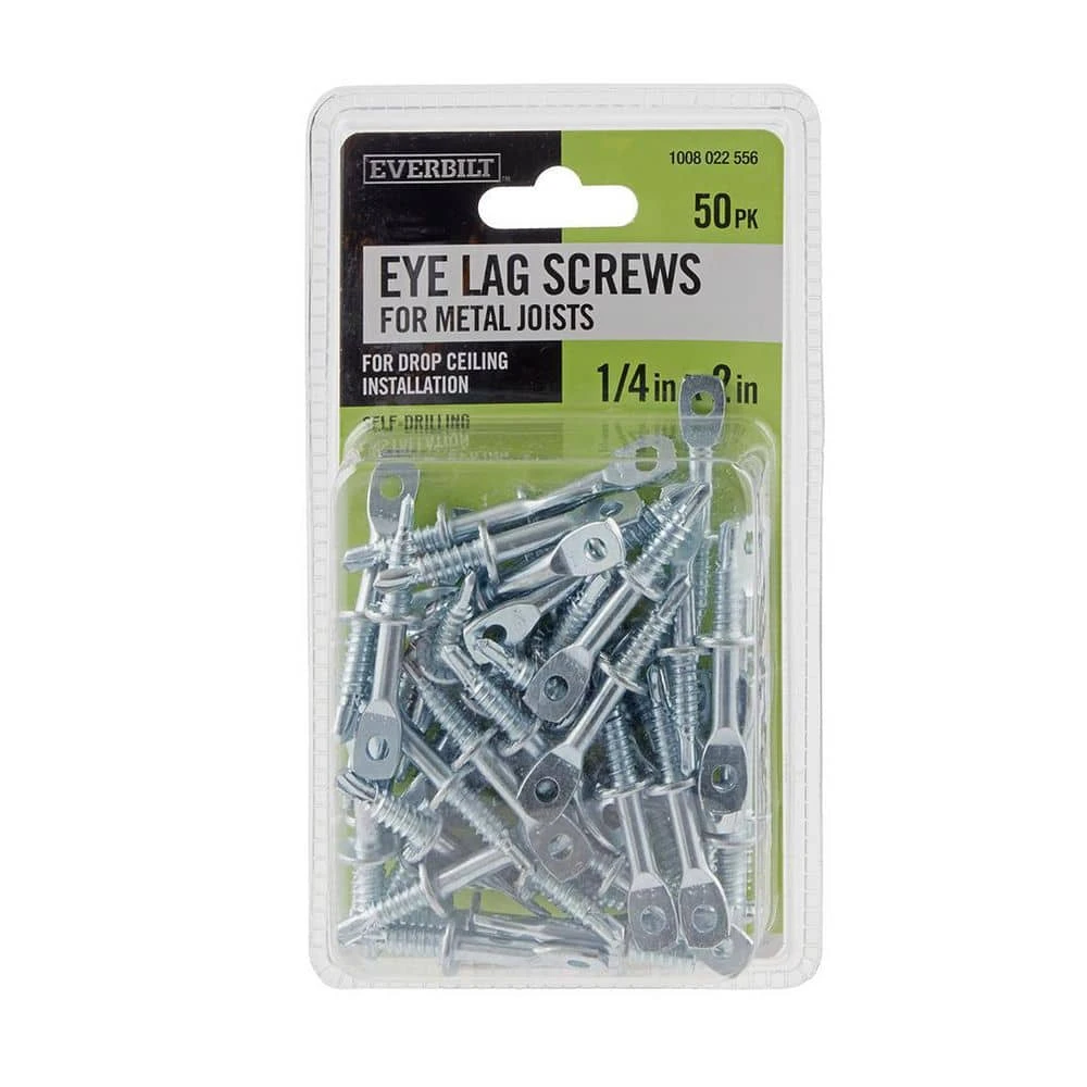 The Everbilt Eye Lag Screws for metal joists measure 1/4 in. x 2 in.. These Eye Lag Screws are specifically designed for suspended ceiling grid installations and feature a self-tapping drill point for easier installation. Packaged in a 50-piece pack for attaching ceiling hanger wire to metal joists.
