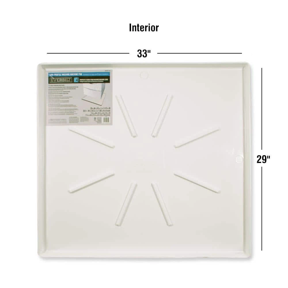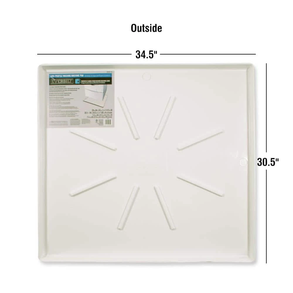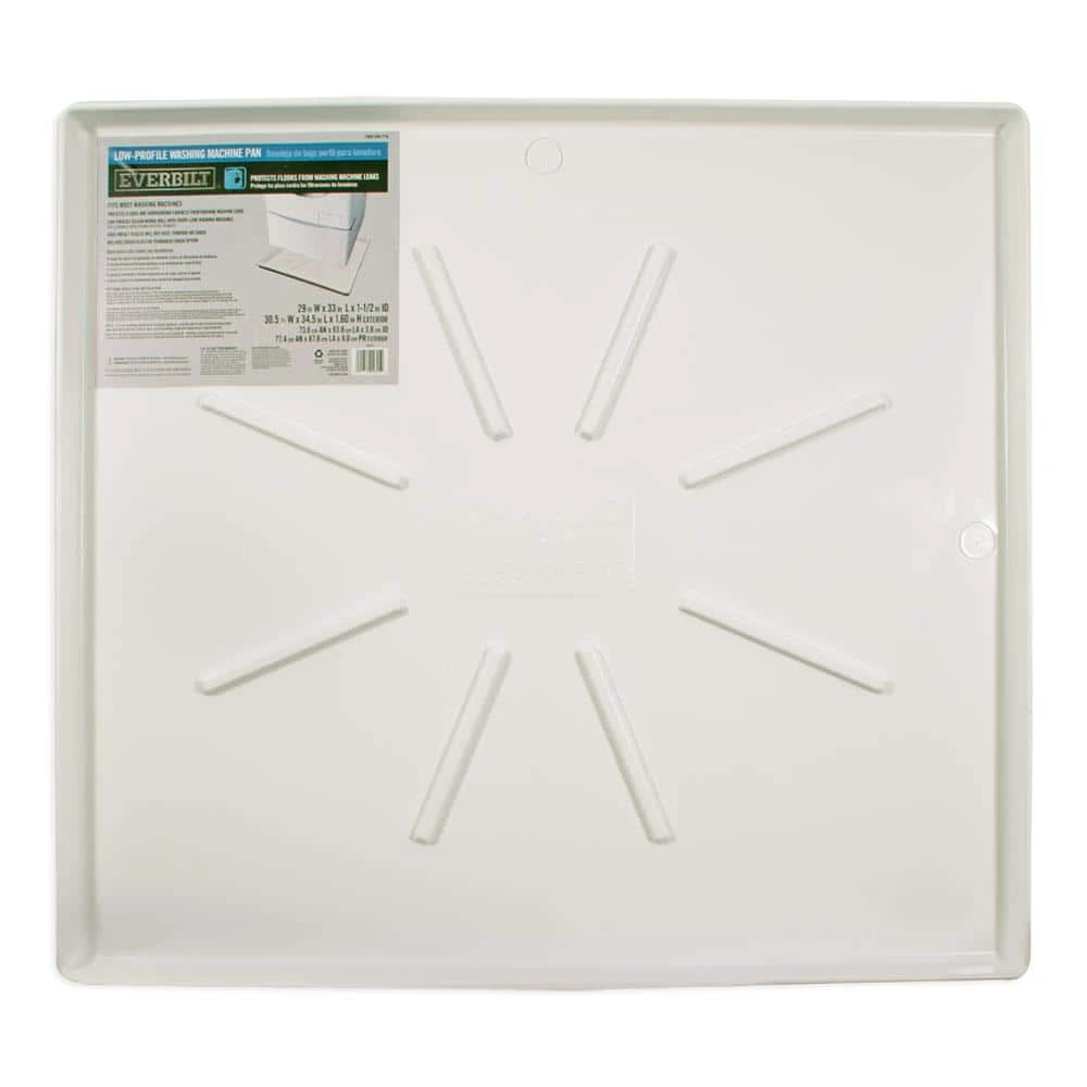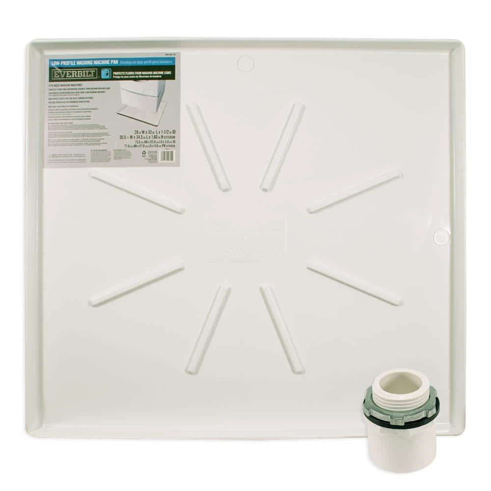 The Everbilt washing machine drain pan is made of high-impact molded polypropylene plastic. A 1-piece injection molded design provides strength and durability preventing it from cracking, rusting, or corroding. The pan protects your floor from scuffs, spills and overflows including harsh detergents and bleach. The drain pan has 2 formed punch-out holes, where an optional 1 in. PVC male drain adapter (included) can be attached to release the water collection into a bottom drain outlet. This washer pan works well with front-load washing machines. The low-profile design allows for clearance when opening pedestal drawers (leveling legs may need to be fully extended).