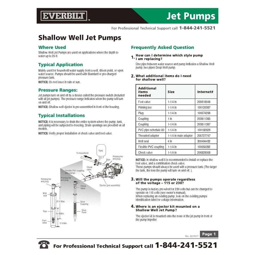 Keep the clean water flowing into your home, cabin or farm, with the Everbilt 3/4 HP Shallow Well Jet Pump. The pump housing is constructed of fiberglass-reinforced thermoplastic, which is both light in weight and corrosion-resistant. The pump delivers water at a flow rate of 552 GPH at 40 PSI and 0 ft. of lift. The motor is safeguarded by an auto reset thermal overload protector to prevent overheating. It is pre-wired for 115/230 Volt operation, factory preset at 230V. The pump comes ready to install. 1 Year warranty.