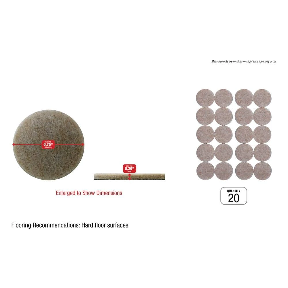 3/4 in. Heavy-Duty Self-Adhesive Felt Pads (20 per Pack) are intended for use with wooden legs of chairs, tables and other furniture. These felt pads can protect furniture and floor surfaces from scratches. They help reduce noise and friction while you move furniture across hardwood and laminate floors.