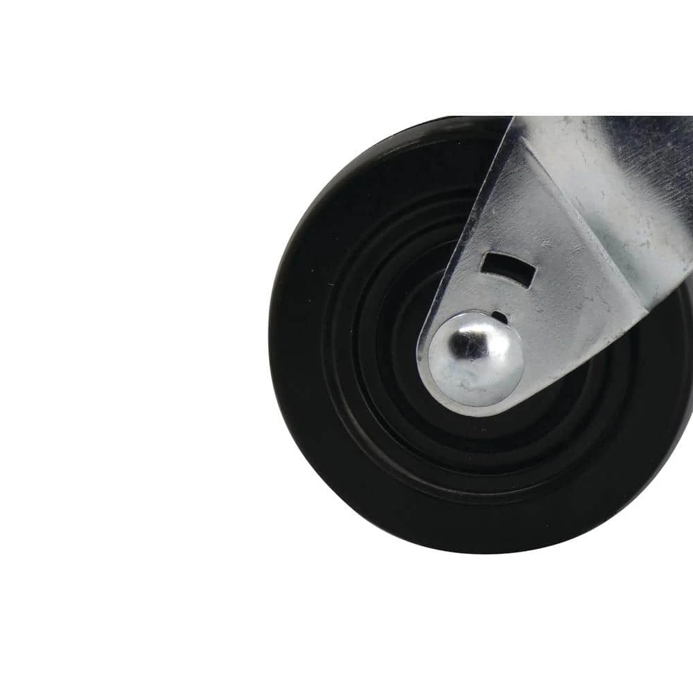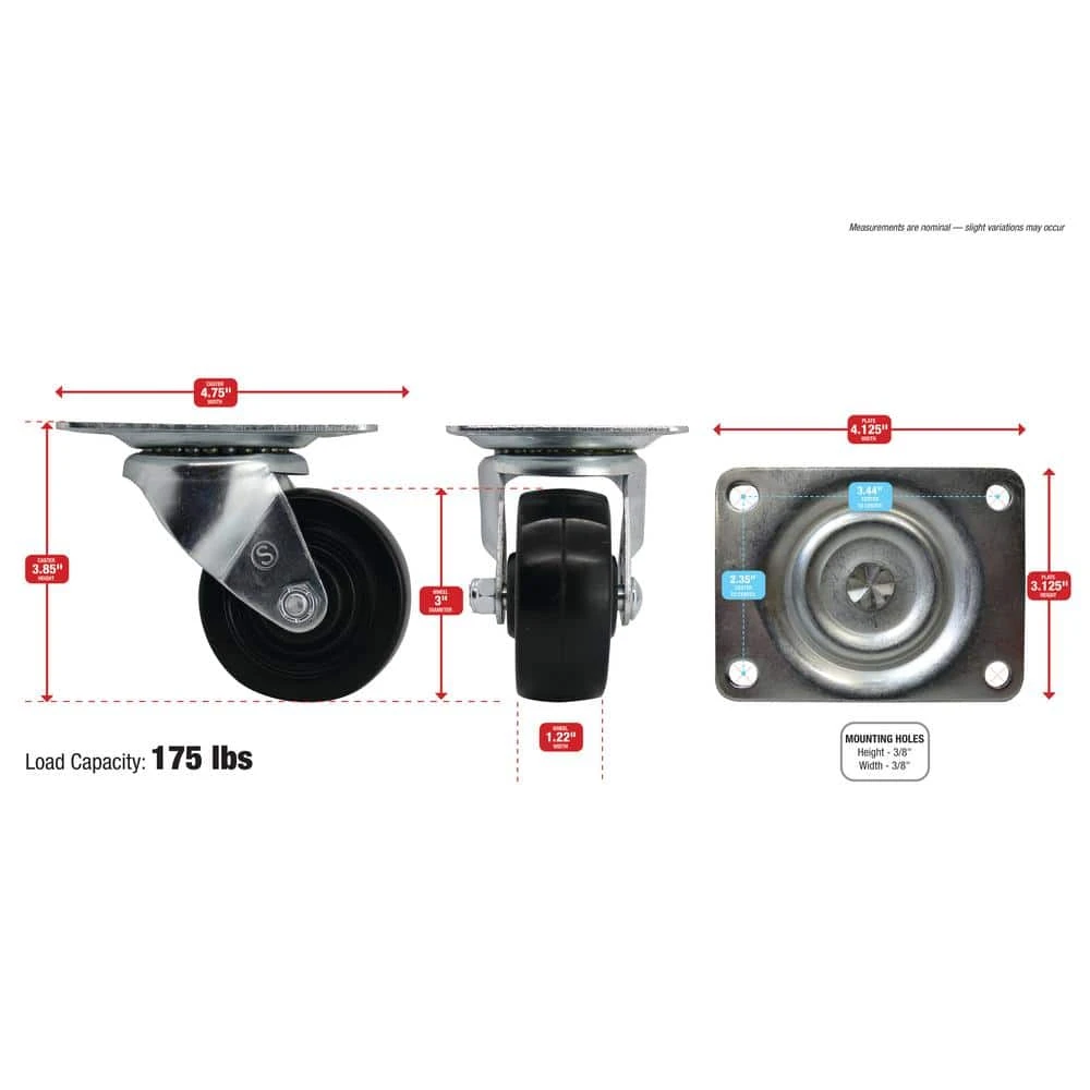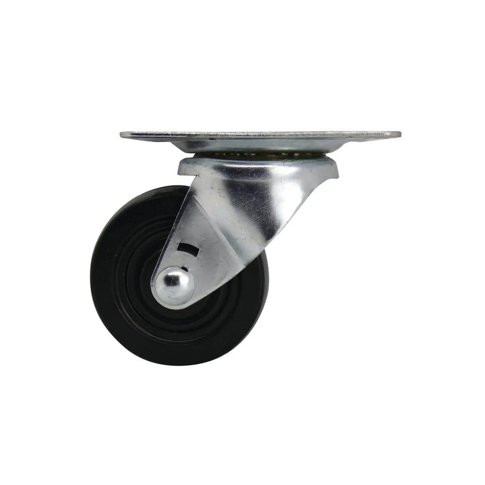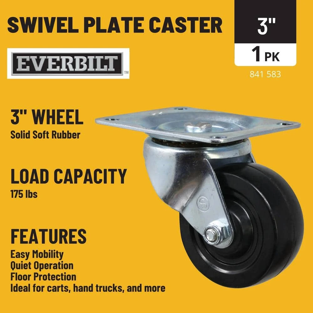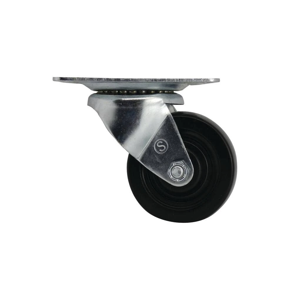 - 3 inch diameter black soft rubber wheel with ball bearing swivel and plate mount