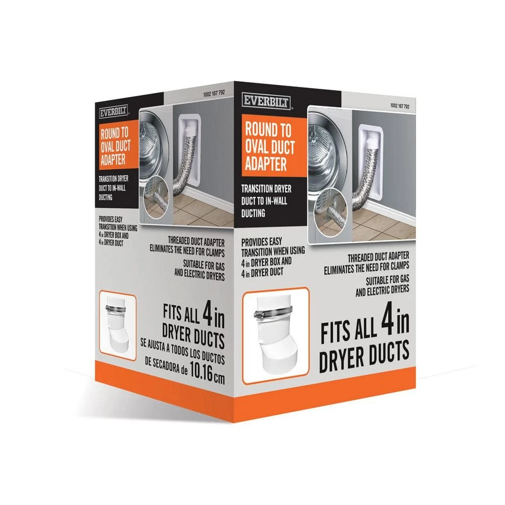 Everbilt’s Round to Oval Duct Adapter allows for the consumer to attach the in-wall oval duct to the round dryer transition duct. This product includes an oval shaped 4 in. galvanized steel worm drive clamp, for easy attachment of the in-wall oval duct to the oval portion of the adapter. The adapter can also be easily disconnected for regular cleaning of the dryer duct.