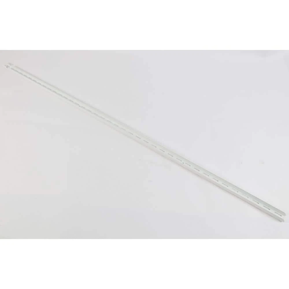 The Everbilt 48in. Regular Duty Vertical Rail is designed to work with the Regular Duty hang track and bracket system to allow wire shelves to be adjusted to any height. Durable steel construction with double slotted design provides strength and durability. Vertical rails should be placed no more than 24 in apart and no more than 4 in away from the end of a shelf for stability. For additional strength install vertical rails 16 in apart and mount directly to a stud.