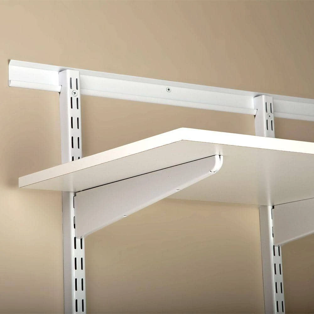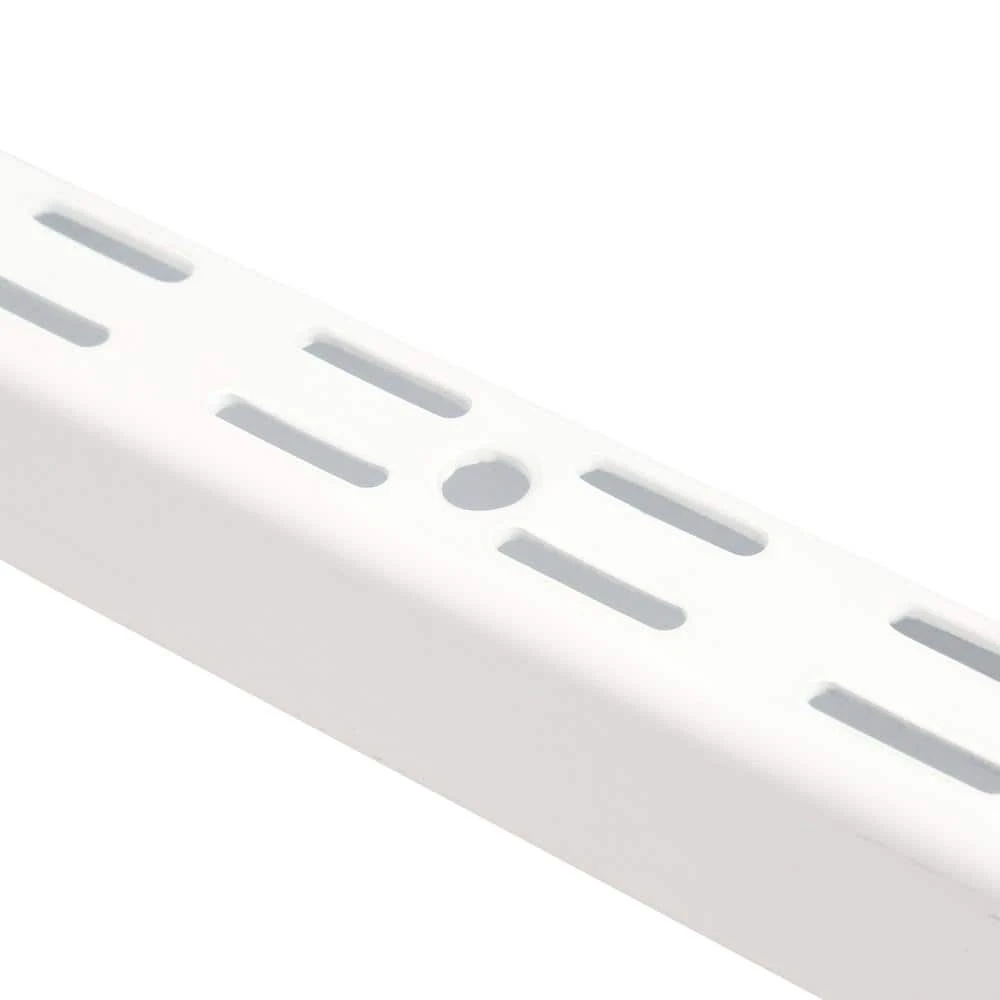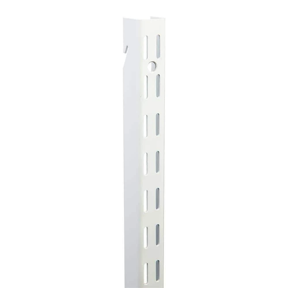 The Everbilt 48 in. White Super Duty Dual Track Wall Standard provides maximum strength for Everbilt Super Duty adjustable shelving installations. The standard has a notch for easy installing onto a Super Duty Hang Track (sold separately), and is 1 in. D x 1 in. W, providing strength and rigidity for your shelving system. The dual slot design is adjustable in 1-1/4 in. increments, allowing for great versatility. Steel construction with a durable white powder coat finish. Standards sold individually.