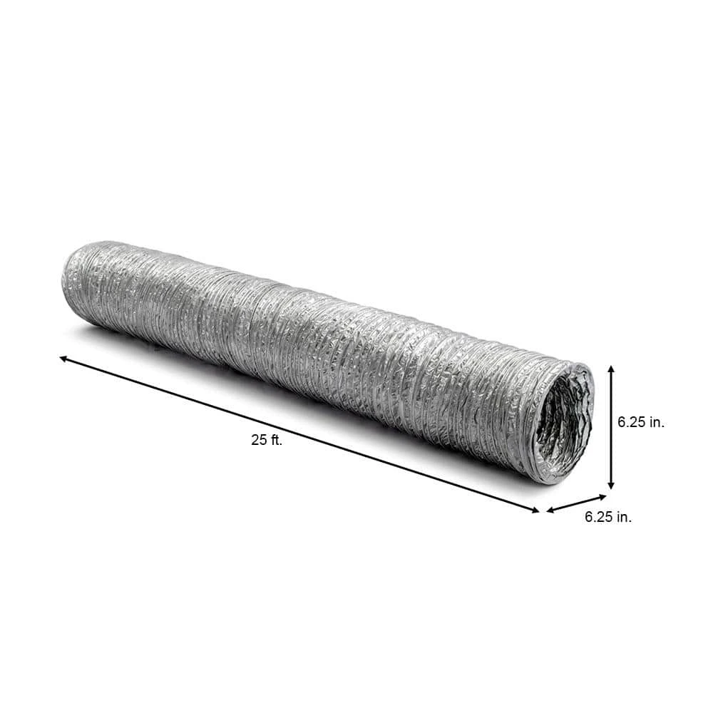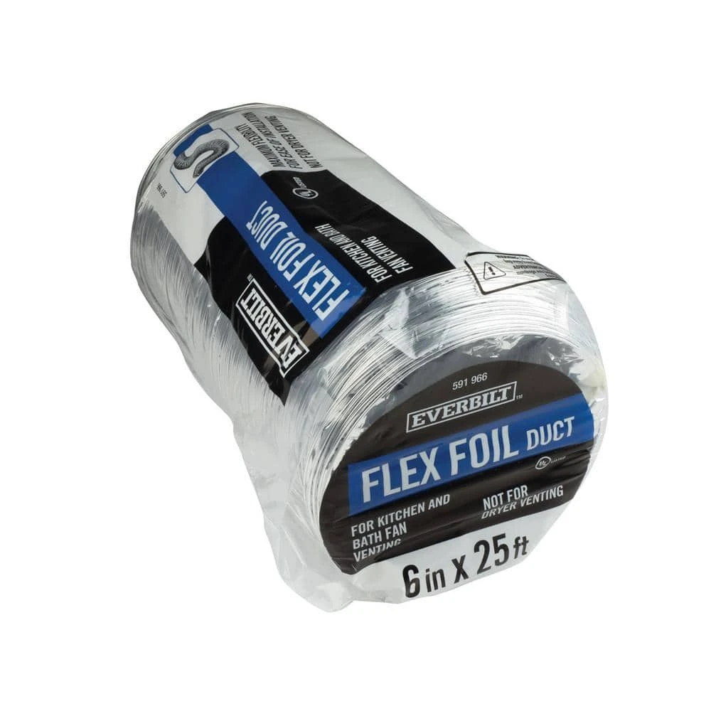 This 6 in. x 25 ft. flexible aluminum foil duct is ideal for bathroom fan exhausting and other general-purpose exhaust applications. 3-layers of aluminum foil laminate are included in its composition that will withstand up to 250 degree F temperatures. This product has been rated as an air duct connector under UL 181.