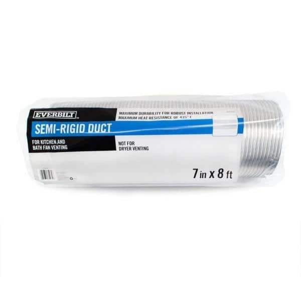 The 7 in. x 8 ft. Semi-Rigid Aluminum Duct is ideal for bathroom fan and kitchen range hood exhausting. This duct is totally noncombustible. It has a maximum operating temperature of 435 degree F.