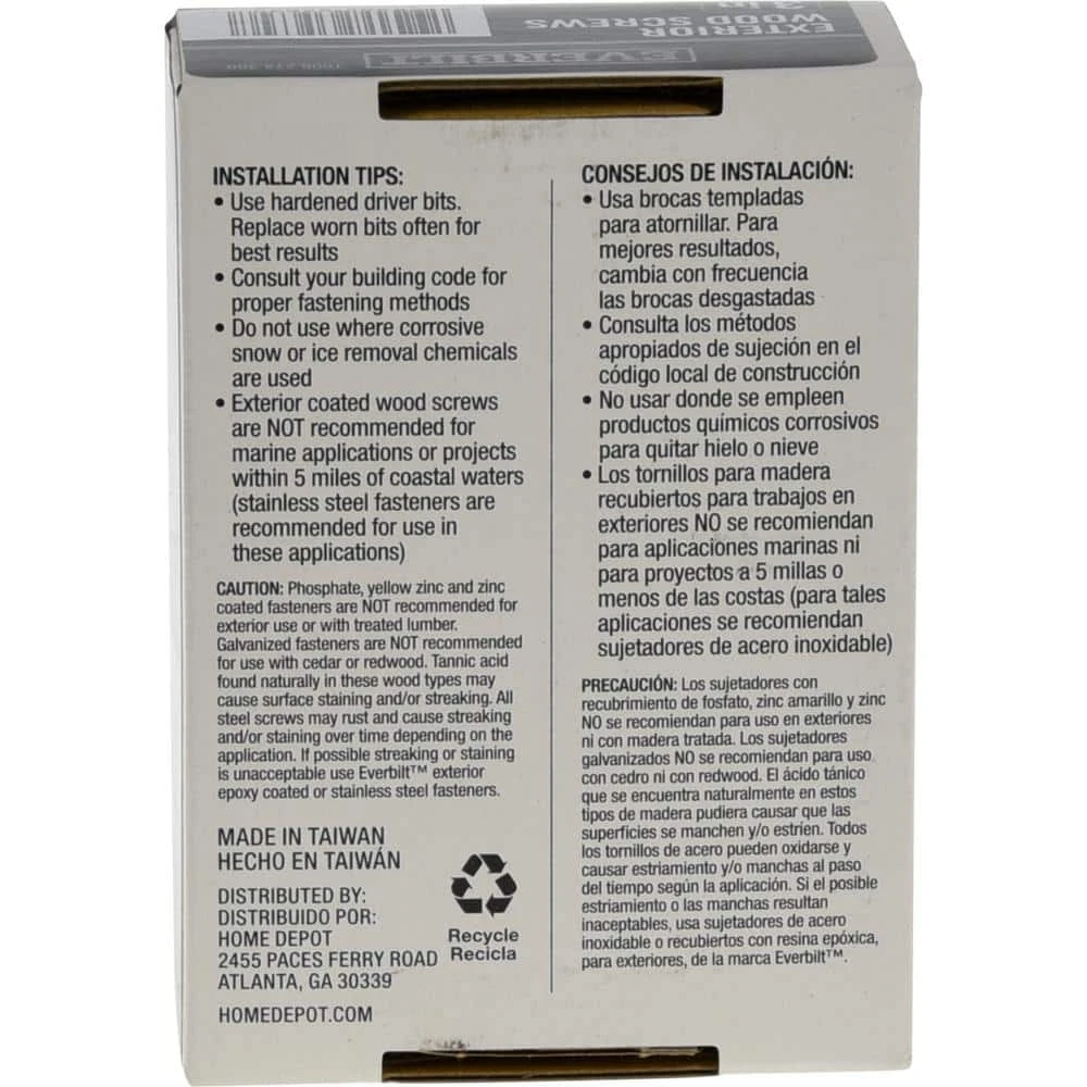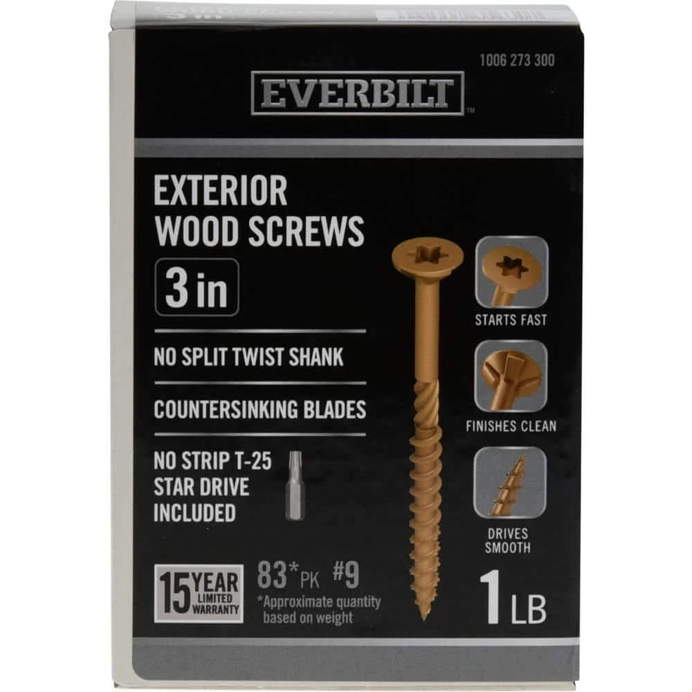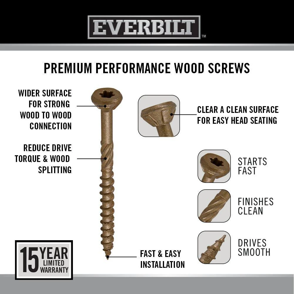 Everbilt high performance exterior wood screws are designed for wood construction and outdoor projects. Unique thread design features ensure a fast start without the need to pre-drill. The spiral shank enables smooth installation and the underhead nibs provide a clean, flush finish. These screws are designed for use with treated lumber and are guaranteed against corrosion.