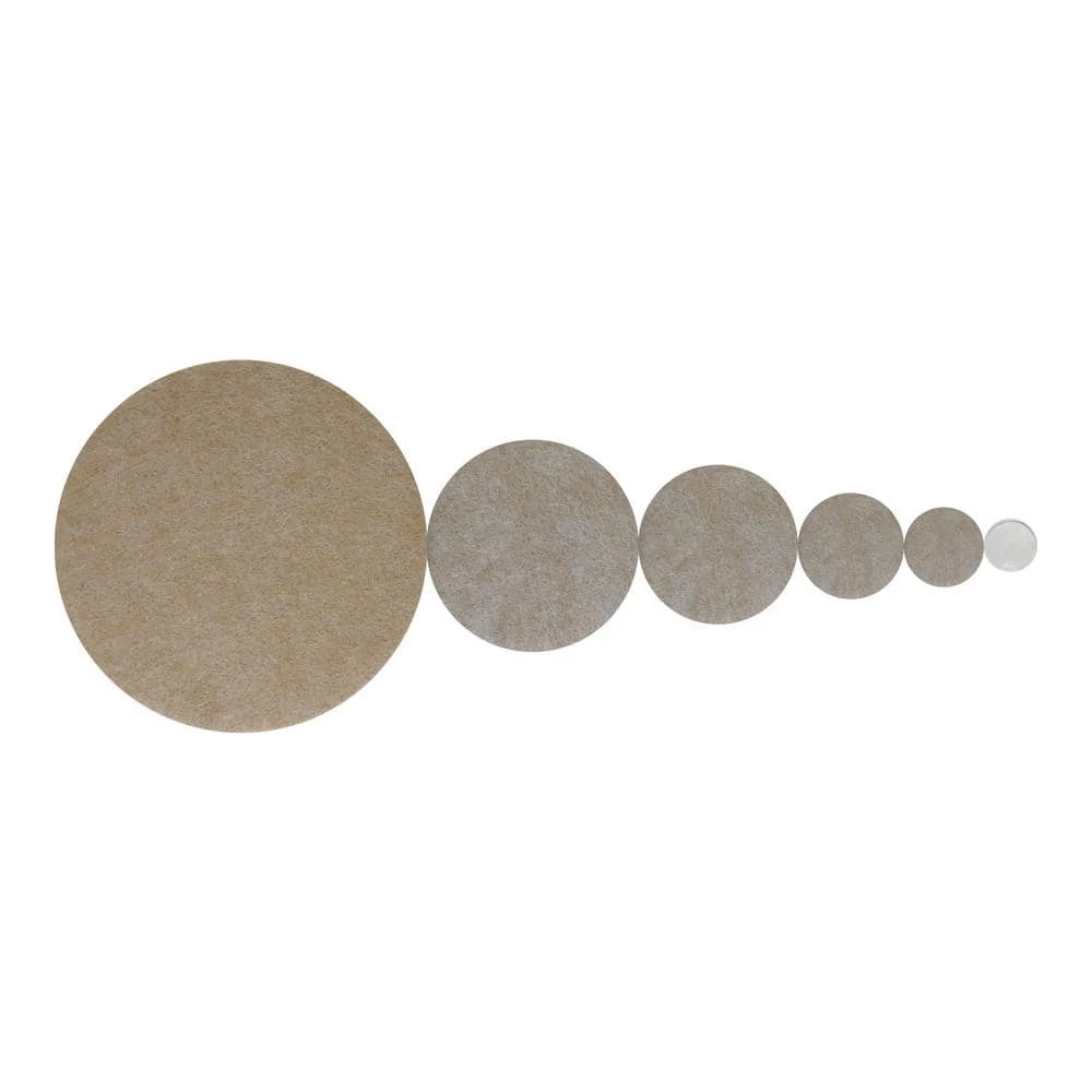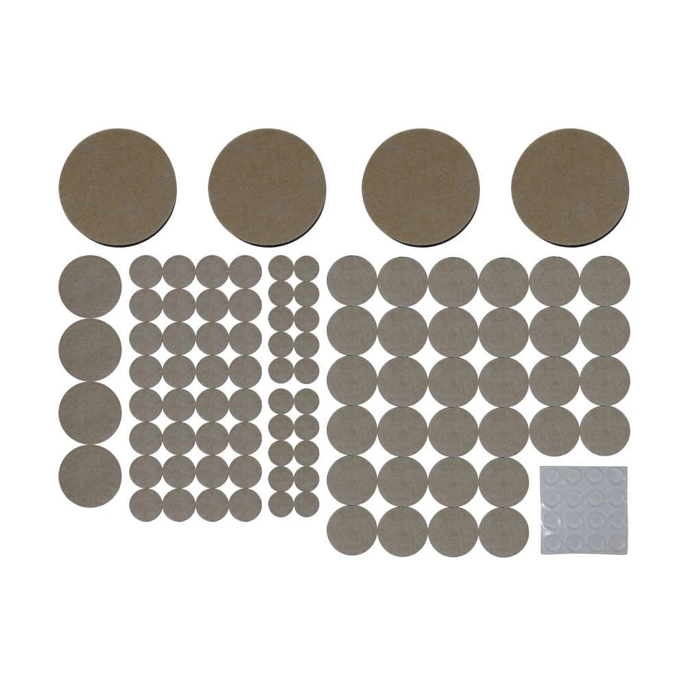 - Contains: 3/4 in. self-adhesive felt pads (20-piece), 1 in. self-adhesive felt pads (32-piece), 1-1/2 in. self-adhesive felt pads (32-piece), 2 in. self-adhesive felt pads (4-piece), 3-1/2 in. felt sliders with foam back (4-piece), 1/2 in. clear self-adhesive bumpers (16-piece)