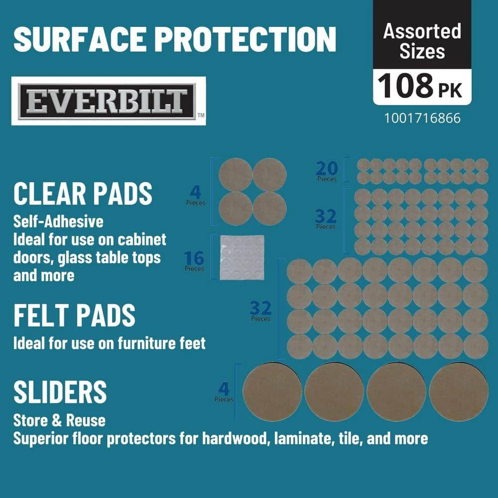 Choose this 108-piece value pack to protect your floors against scratches and dents with Assorted sizes of Shepherd heavy-duty self-adhesive felt pads. The Shepherd 3-1/2 in. felt sliders quickly and easily slide furniture across hard surface floors. Use, then remove and store until needed again. The large size sliders are made with premium quality felt backed by durable foam for repeated use on hard surface floors. The clear self-adhesive bumpers are great for protecting surfaces and deadening sound on small appliances, home and office accessories, cabinet doors, and decorative items.