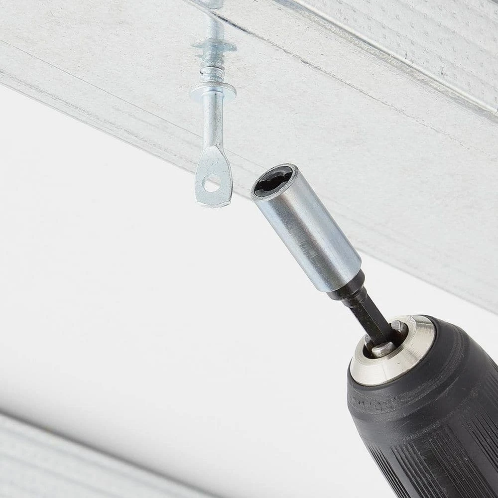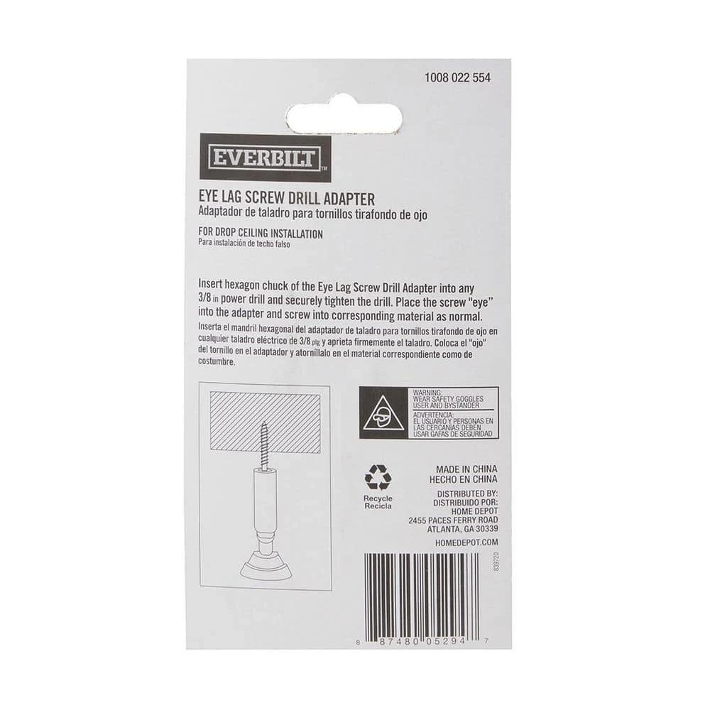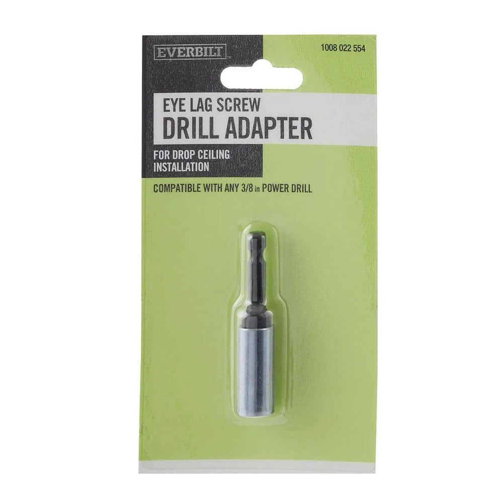 The Everbilt Eye Lag Screw Drill Adapter can be used to install eye lag screws (purchased separately) quickly when installing drop ceiling grid systems. Designed for use with any 3/8 in. power drill. Use the adapter to screw eye lags into corresponding wood or metal joists. The drill adaptor is a key part of the full Everbilt accessory line up for ceiling grid installation and is also included in the model 805354 Ceiling Grid Installation Kit.