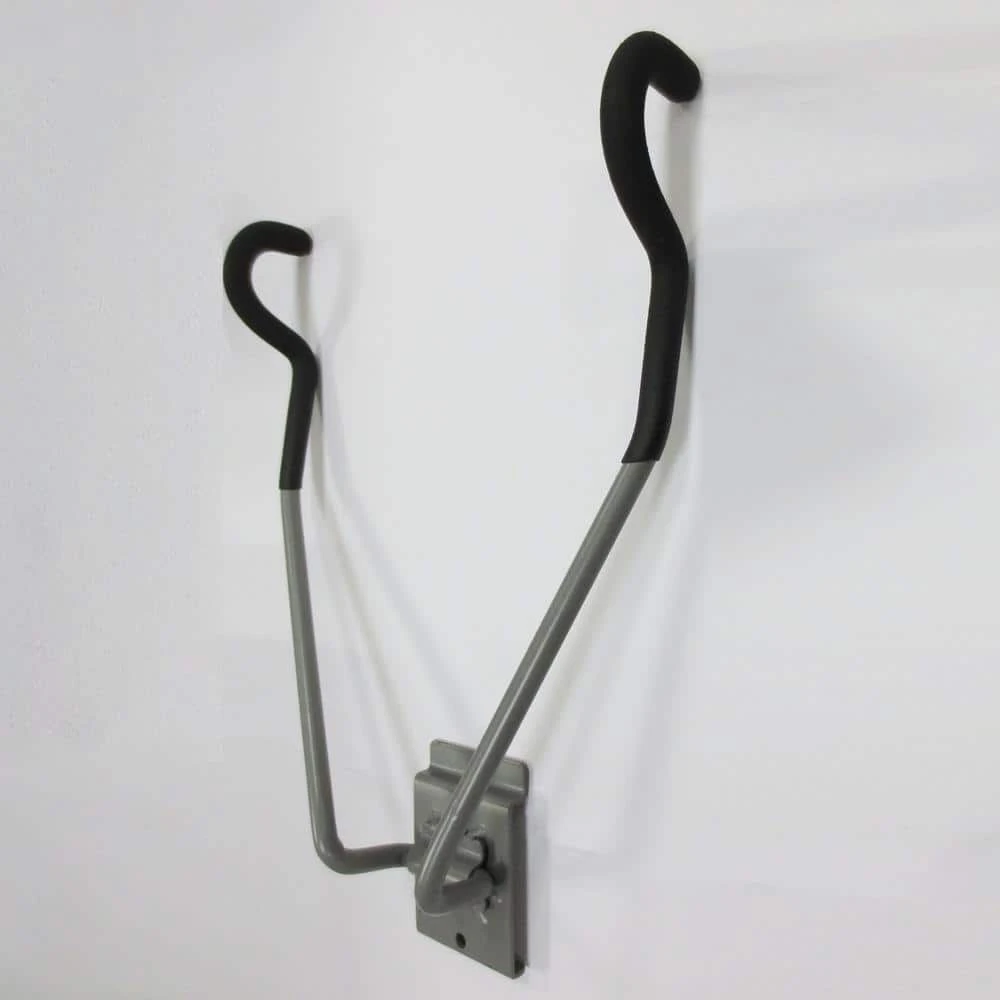 The 50 lbs. Flip-Up Storage Hanger is made of steel and has a protective vinyl coating. It is designed to maximize limited wall space. This wall-mount hanging device can be used around the home or at the office. It holds a standard bicycle for storage or repair purposes as well as tools. To save space when not in use, it flips up flat against the wall and is best mounted to a stud.